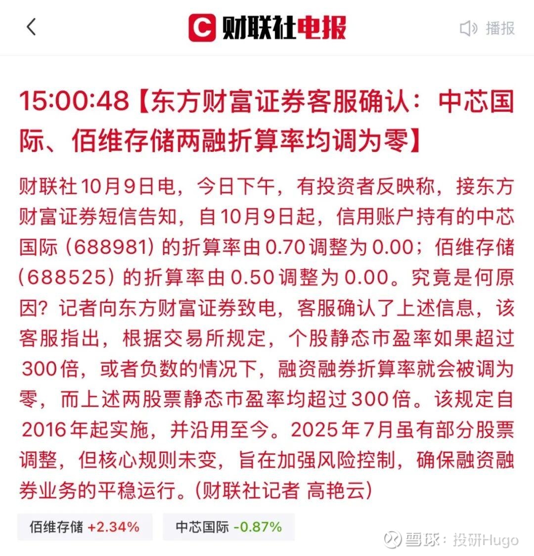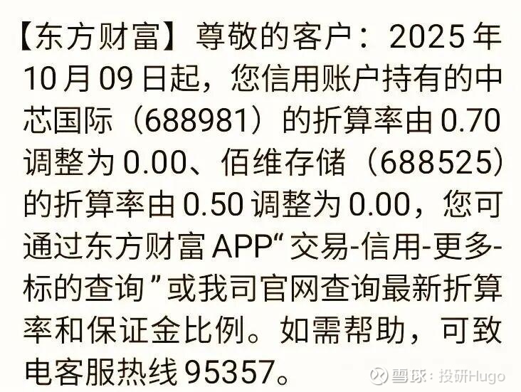 自2025年10月9日起,您信用账户持有的中芯国际(688981)折算率由0.70调整为0.00,佰维存储(688525)折算率由0.50调整为0.00。
