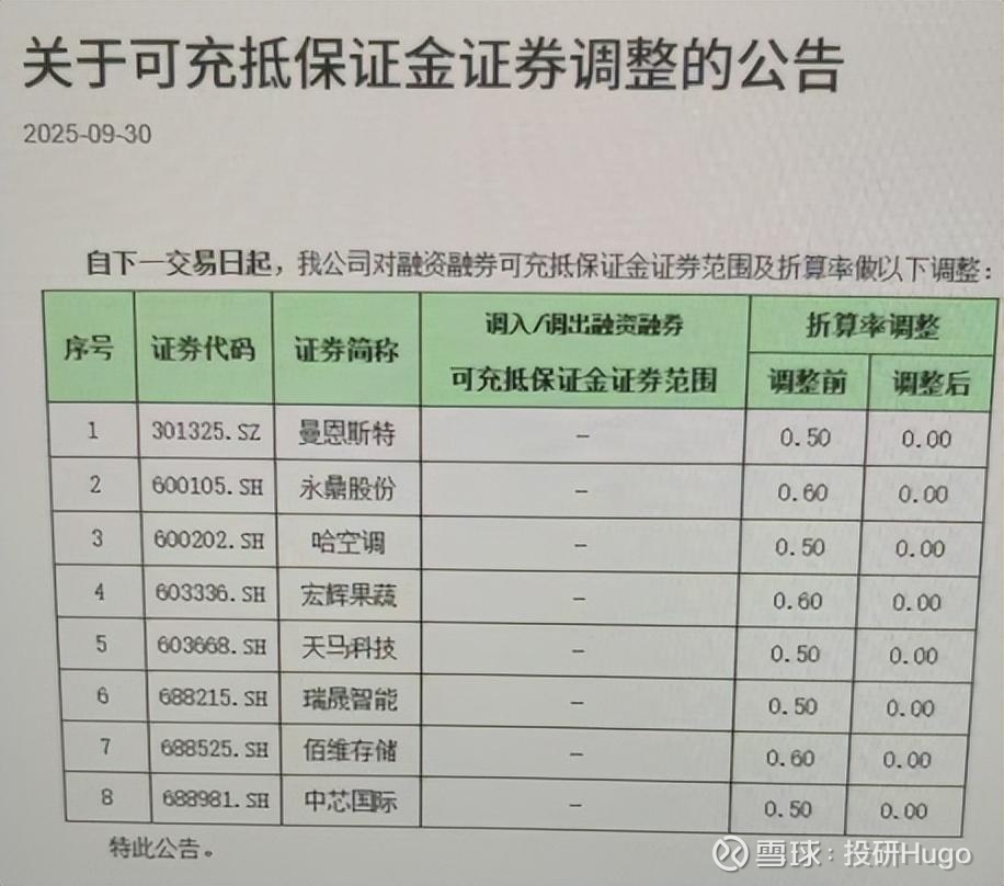 同时,国信证券官网也同步发布了《关于可充抵保证金证券调整的公告》,在其列表中,曼恩斯特、永鼎股份、哈空调、宏辉果蔬、瑞晟智能、佰维存储、中芯国际等八只股票的折算率全部调整为0。
