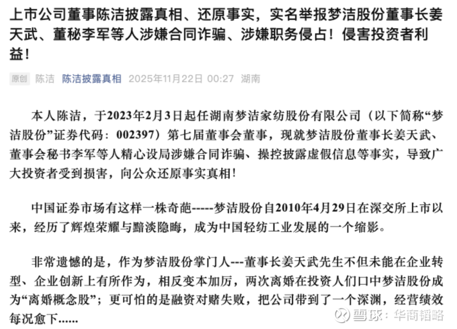 一边,是上市公司湖南梦洁家纺股份有限公司(下称“梦洁股份”)董事陈洁,通过个人社交平台,以“请君入瓮”“趁火打劫”“欺上瞒下”“赶尽杀绝”“偷天换日”等凌厉字眼,实名举报公司董事长姜天武及董秘李军涉嫌合同诈骗、职务侵占等多项严重问题。