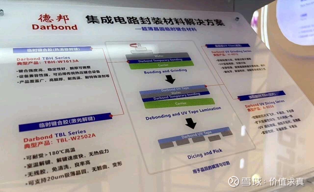 在晶圆级封装环节,德邦科技推出多款核心材料,保障晶圆加工精度与良率。其中,UV减薄膜、UV划片膜专为晶圆减薄与切割工艺打造,具备强力支撑性能,可有效防止晶圆崩边、掉片,经UV照射后能快速减粘、轻松剥离,大幅提升晶圆加工良率;TBH、TBL系列临时键合胶,为超薄晶圆减薄、TSV露出、Cu柱研磨等关键工艺提供可靠临时支撑,可耐受CMP、蚀刻等严苛制程环境,解键合分离快速便捷,全方位保护晶圆完整性。