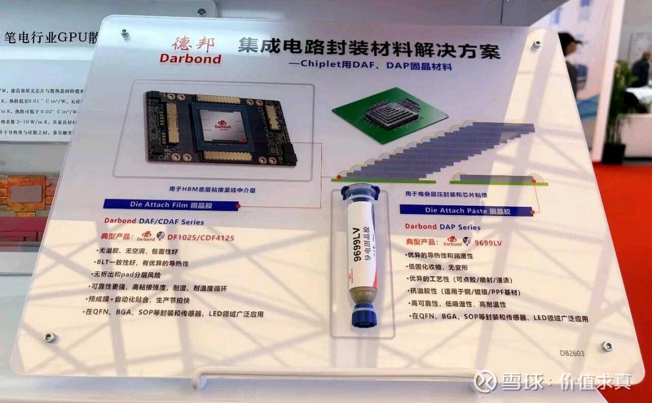 芯片封装材料板块,德邦科技多款产品精准匹配大尺寸、2.5D/3D堆叠等高端封装量产刚需。翌骅固晶胶(DAP/CDAP)与固晶膜(DAF/CDAF),可实现切割固片不散片,完成芯片与基板的永久粘接,完美适配3D堆叠封装,显著提升封装可靠性与稳定性;Underfill 6568系列底部填充胶具备快速固化、高效缓冲应力的特性,Dam&Fill 6557系列一体化封装胶拥有强效抗形变、防潮防损的优势,全面满足高端封装场景需求;DM系列LMC液态环氧塑封料,可应用于Fan-out、HBM封装工艺,具备低翘曲、流动性优异的特点,为先进封装提供优质塑封防护。