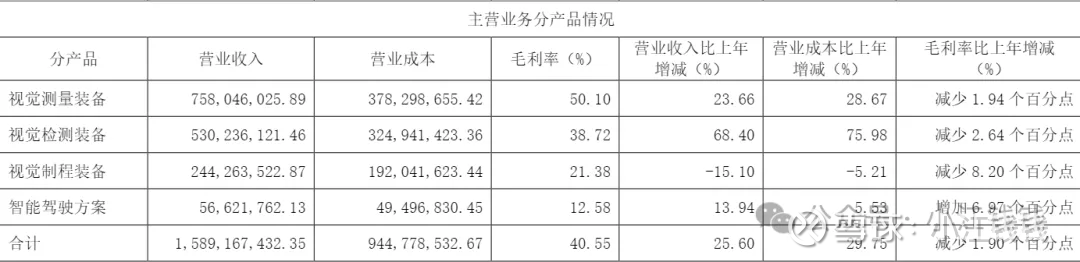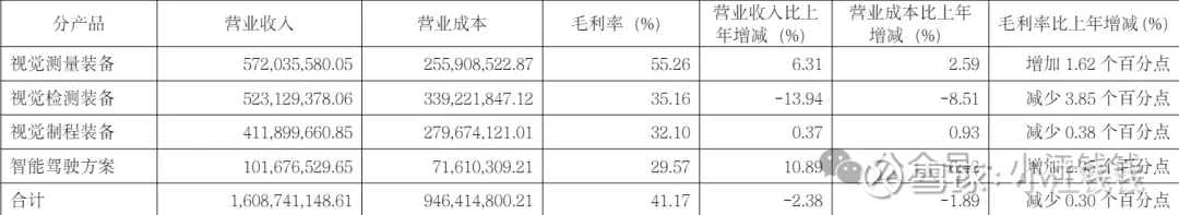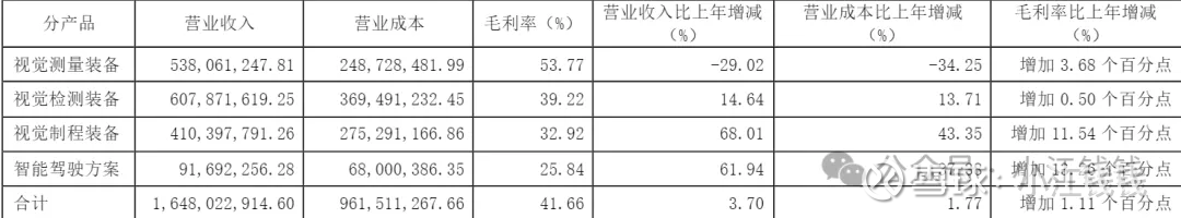 营收 16.09 亿,同比减少 2.38%,扣非 1.03 亿,同比减少 34.5%。视觉检测装备产品的收入下降,主要是受光伏行业周期波动影响,公司的光伏硅片检测分选设备收入同比下降25.85%。此业务对应毛利同比下降7,978.75万元,对公司整体净利润造成较大影响。