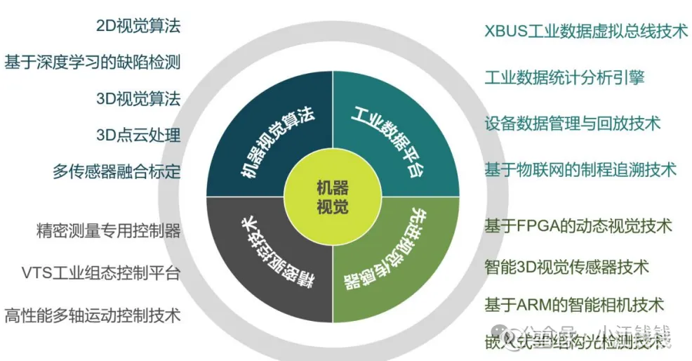 公司在机器视觉核心技术的关键领域获得多项技术突破,具备了开发机器视觉底层算法、平台软件,以及设计先进视觉传感器和精密驱动控制器等核心组件的能力。公司核心技术包括机器视觉算法、工业数据平台、先进视觉传感器及精密驱控技术四大领域。