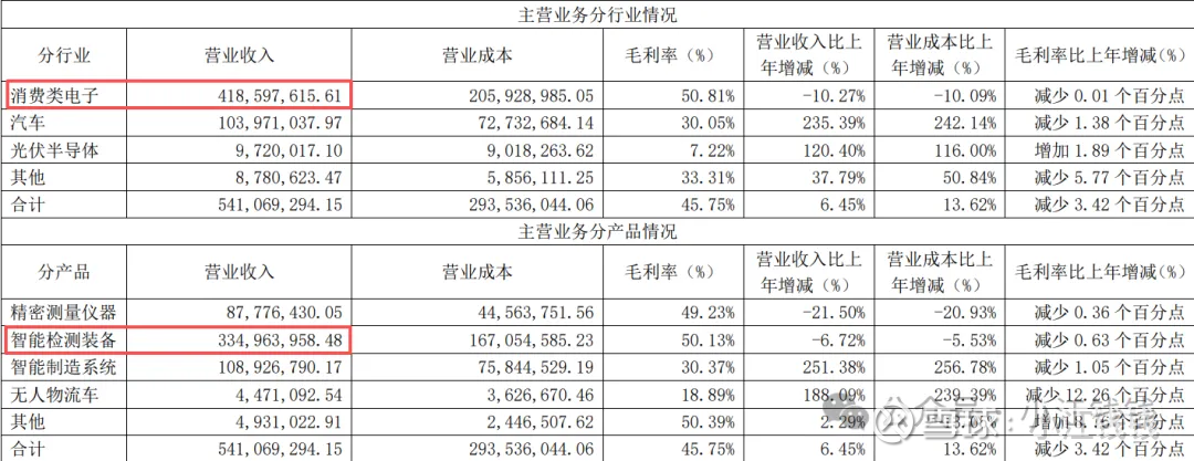 营收 5.41 亿,同比增长 6.45%,扣非 6672 万,同比下降 22.3%。利润下降的原因是苹果订单不及预期,研发投入增加。本期智能制造系统在汽车行业收入增长较大实现了重大突破;无人物流车产品本期新开拓了面向无人物流场景的 AI 边缘计算业务导致订单额增较大,但此业务占整体收入比例相对较小。主要情况如下: