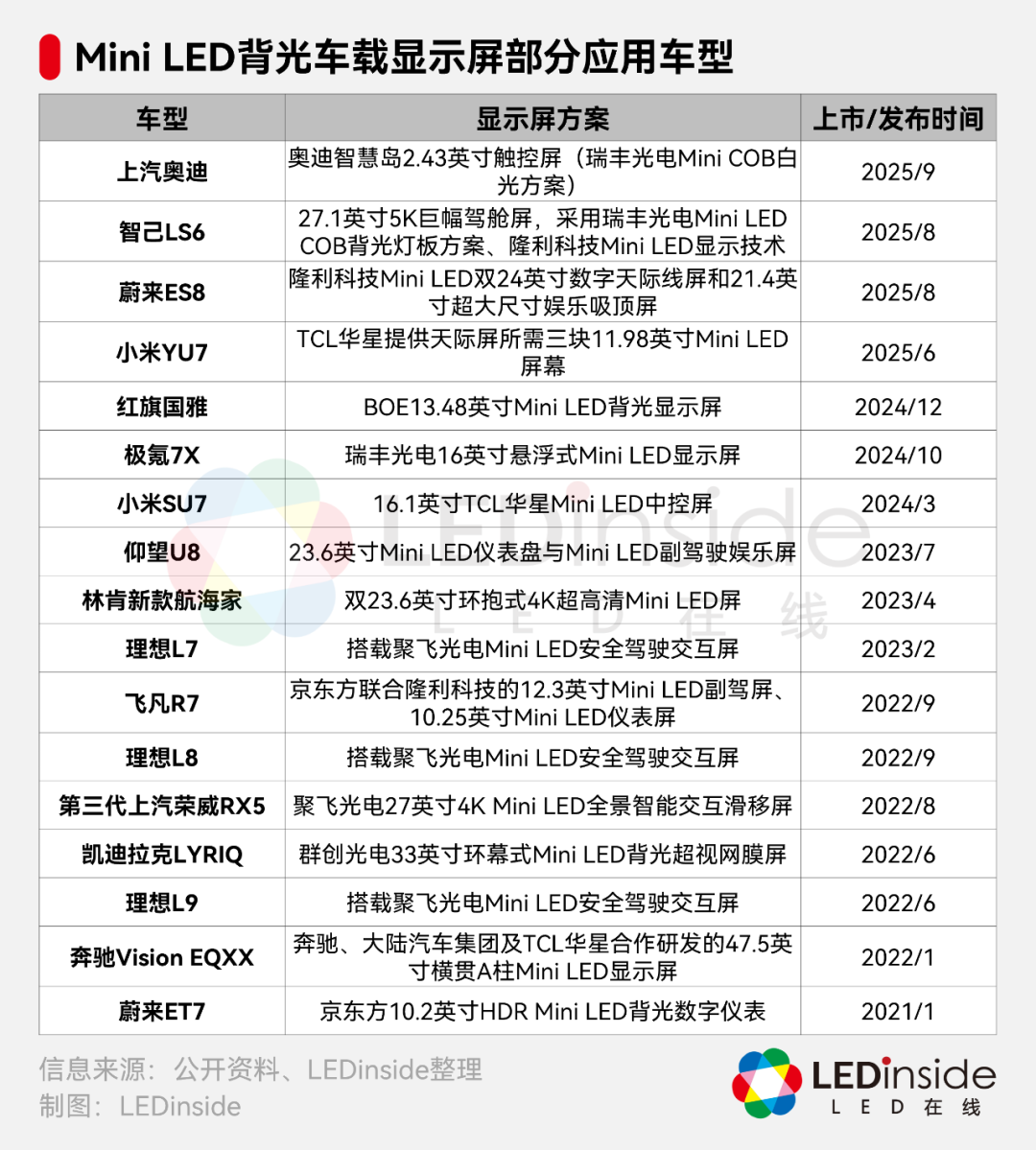 近年来,随着智能座舱和多屏化趋势的发展,Mini LED背光技术在车载显示领域的应用日益广泛。据LEDinside不完全统计,已有17款车型搭载Mini LED屏幕,主要用于中控屏、仪表屏、副驾驶等显示领域。