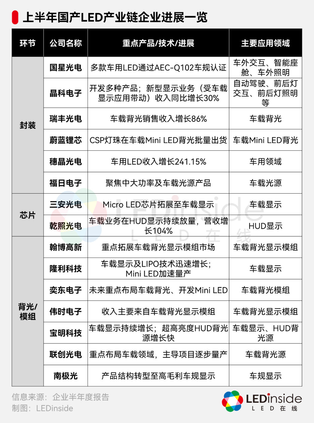 不仅终端LED车灯企业表现突出,今年上半年,产业链上封装、芯片等环节的企业也在车用LED市场取得了积极进展。