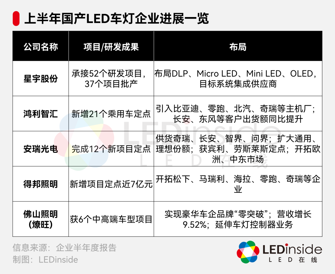 在车灯领域,上半年,星宇股份、鸿利智汇、安瑞光电、佛山照明、得邦照明等纷纷加快研发与项目导入,拓展比亚迪、奇瑞、长安等主机厂客户,出货量稳步提升。部分车灯企业如星宇股份,已开始已从单纯供应照明部件,逐渐迈向“感知+显示+交互”的系统集成方向。