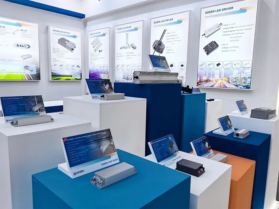 崧盛电源展示覆盖户外、工业、商业、植物及体育照明的全场景LED驱动电源方案。
