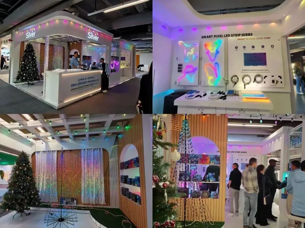 银禧光电展示了多款智能照明产品及系统解决方案。核心展品包括智能氛围动态调光系统、节日灯串联动方案以及户外柔性灯带。其中,智能氛围动态调光系统可根据场景和时间实现光强、色温的动态调整,适用于商业、办公及公共空间。