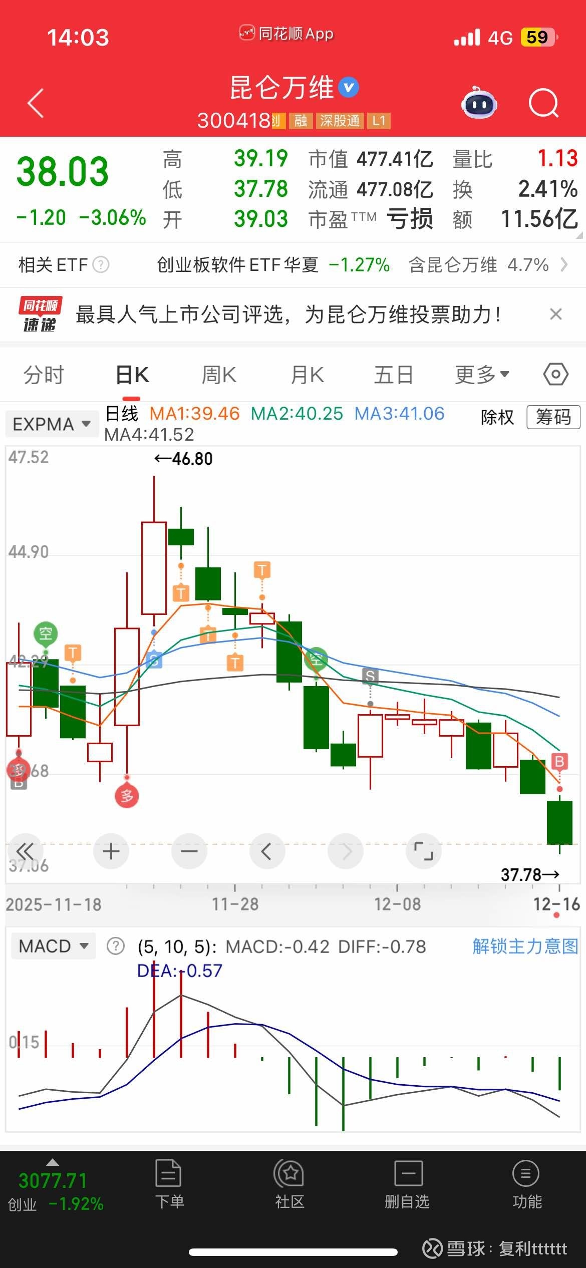 $昆仑万维(SZ300418)$ 说一下今天B回昆仑逻辑,半个月前说跌破3816,上周说变盘节点在周二附近,今天周二如期跌破3816,本周是容易见指数低点,尤其是在3800点附近,这波是左侧,买在底部区间即可,这里3800看机会,并且这个反弹有持续性的,暂且看3天以上,至于反弹还是反转,个人还是看反弹,时间关系,和下3700大概率走一波5浪结构,目前我们即将迎来四浪反弹,所以周三-周五的某一天向下都是机会,知行合一!明天有机会还会加!半个月前45走了,跑在日K高点,但不在分时高点,交易里,完美是陷阱,接受“买不到最低、卖不到最高”的不完美,反而能走得更稳。