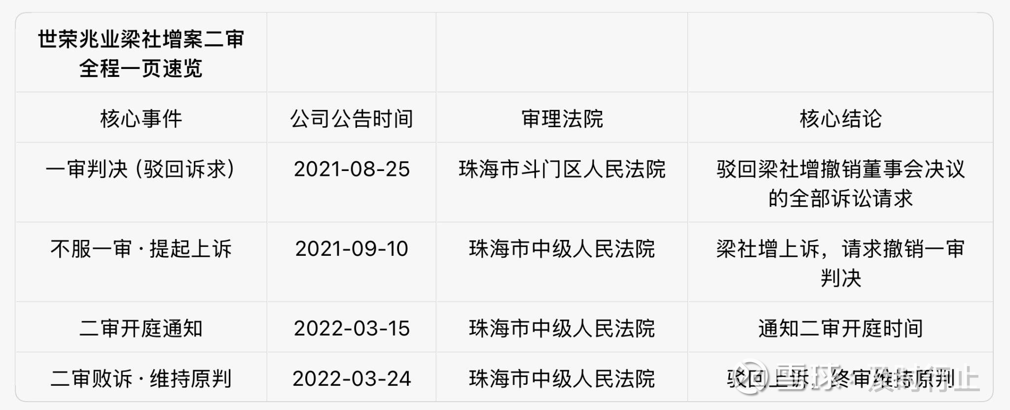 $ST通葡(SH600365)$ 贴图,世荣兆业梁社增案二审过程时间点一览表。基本是按照规定来的,算算通葡二审也快了吧。回想下仲裁案,大连嘉得系伊兵关联方,印鉴担保确实极有可能存在伊个人套现的嫌疑。2亿借款截止21年7月本息达到3亿一直滚雪球到今天的话估摸4亿是有的,大连鼎华真是冤大头吗?还是伊潜在的关联方?伊嘉德鼎华撮局拉公司下水(我不还你别要急死他)?不然为何伊着急转手公司,为何大连鼎华迟迟不申请执行拍卖大连嘉德和伊的资产?为何公司知道追偿难却一直执着于通过法律途径维护权益?查看图片