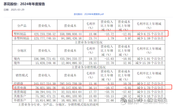 同时,发行人招股意向书宣称“茶花股份在其年度报告中没有披露其线上直销或具体平台的毛利率情况”,这样的重大虚假陈述可能也就只能糊弄下并不尽职的深交所审核员,投资人只要查阅下茶花股份年报就能发行异常(见下图所示)。
