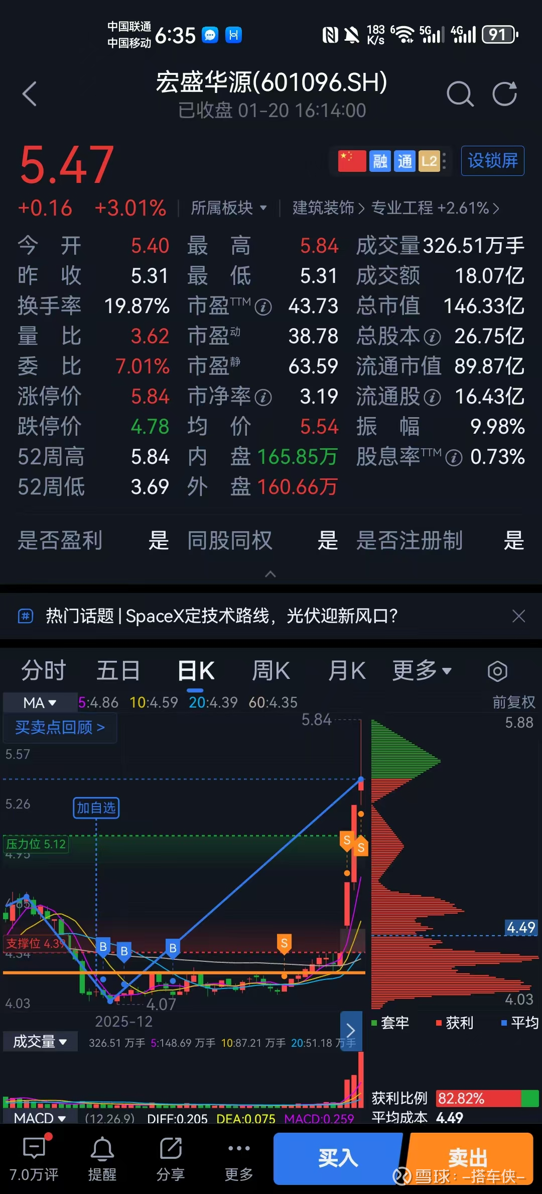 继续减仓之前的一只电力设备票宏盛华源(SH601096),高位减仓,理由是量放出来了换手率也不断增高,作为散户闭眼玩家,已经很难做分析,不知道是散户接盘、还是其他庄家接盘、还是有打板流跟风,所以这种时候,不在我的能力范围内,就该理性的退场保住胜利成果。目前只留了复利底仓在里面,成本价1.49元,持仓38天,盈利30.97%。 所以还是劝散户朋友们,不要盲目追高,成本越高风险越高。