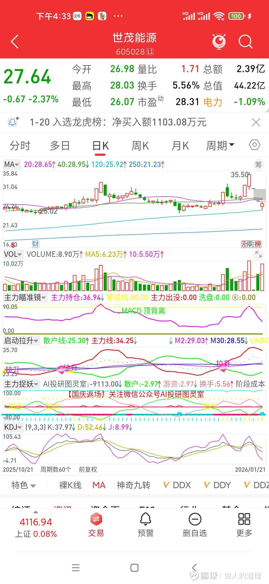 · 1月21日(最新战况):今天股价继续低开,最终收在27.64元,又跌了2.37%。但有趣的事情发生了:主力资金净流入了4000万,而散户和游资在卖出。这说明啥?有“聪明钱”觉得,这波情绪杀跌,有点过头了,开始在低位偷偷捡筹码。