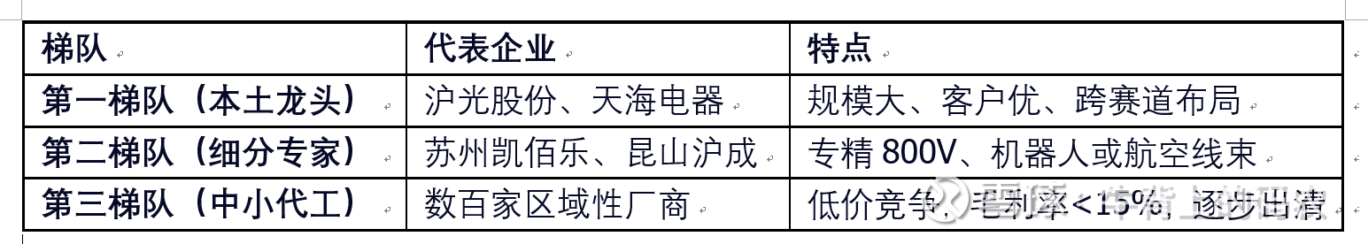 • 中游:长期被安波福(Aptiv)、矢崎(Yazaki)、莱尼(Leoni)等外资巨头垄断,全球CR5超60%。但本土企业正加速突围。