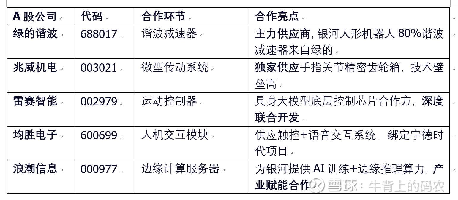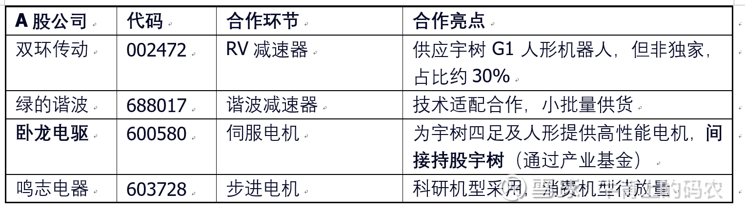 逻辑提炼:宇树的合作更偏向“技术适配”,无独家绑定,但因其技术标杆地位,一旦放量,相关标的弹性极大。