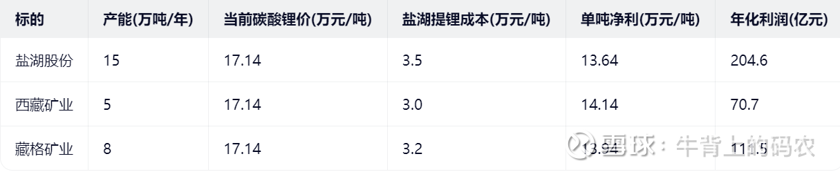 西藏矿业5万吨产能,由于扎布耶盐湖的天然优势(成本仅3万元/吨),单吨净利达14.14万元,弹性高于盐湖股份。