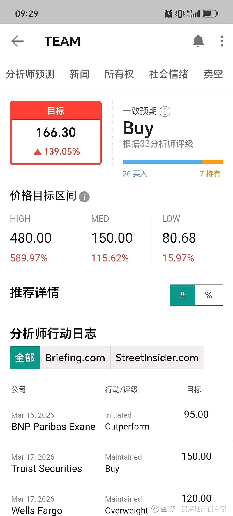 $Atlassian(TEAM)$ 74美元前段时间卖掉了,昨晚把其他股票减仓了一些,再买回来了。现在这股价已经计入默认TEAM转型AI智能平台失败,破产了,已经跌到52周最低价,今年以来股价跌幅57%,250日股价跌幅71%美股跌起来真狠,反人性。华尔街33位分析师给的166美元的平均目标价,好夸张的定价,我喜欢,要么毁灭,要么翻倍