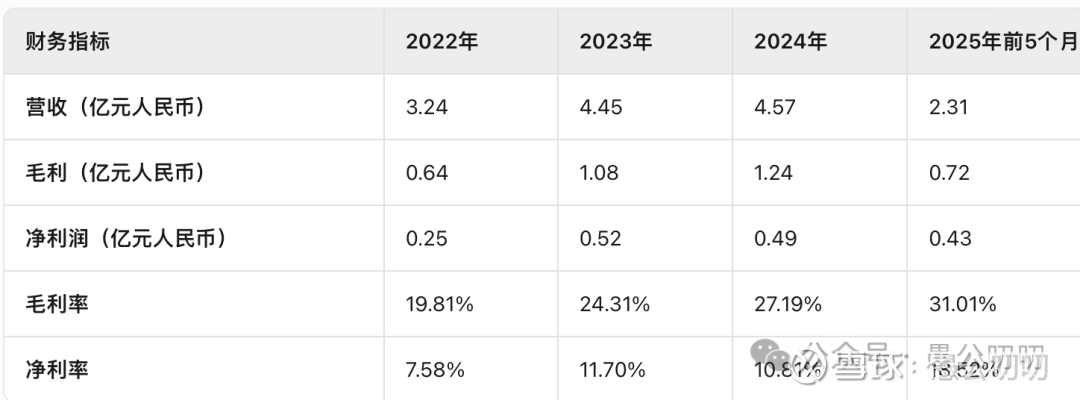 按GMV计算,西普尼2024年在中国足金贵金属手表市场份额达35%,位列第一。公司2022至2024年营收年复合增长率达18.76%。2024年净利润相较2023年有所回落,但2025年前5个月净利润同比大幅增长111.92%,显示出积极的复苏迹象。