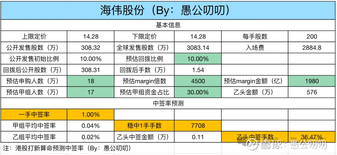 目前海伟股份超购倍数3048倍,按照最终超购4500倍,超购金额1980亿进行预测。
