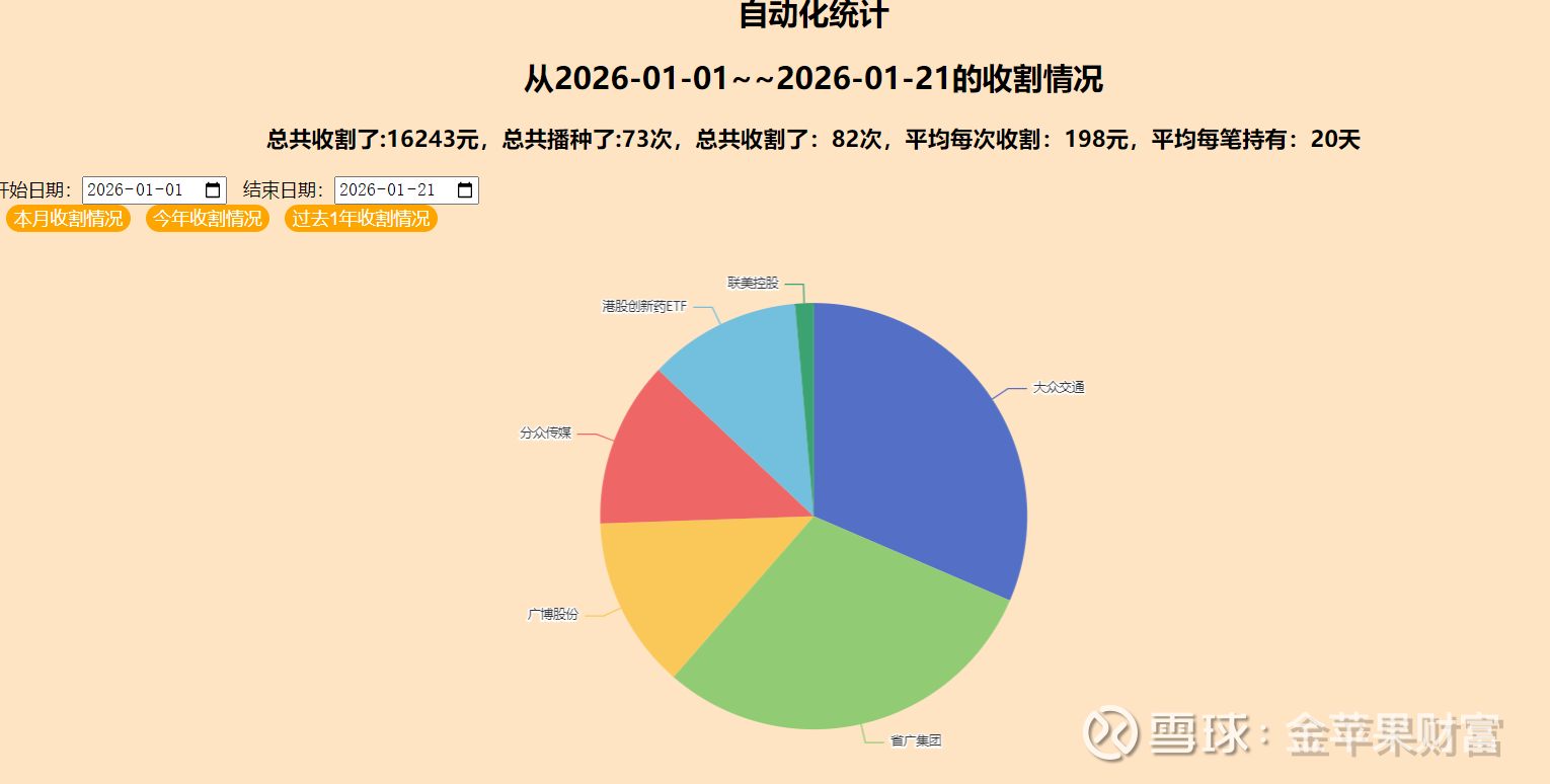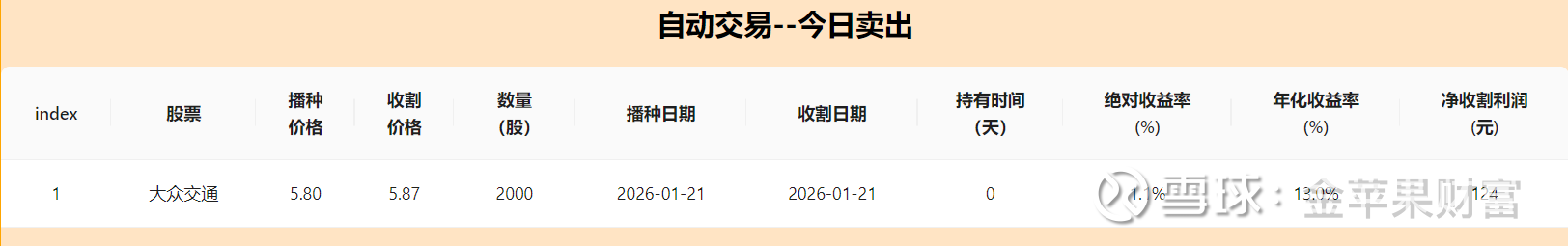 “联合收播机”今日播报(2026.01.21):今日收割1笔、播种1笔(大众交通当天买入、当天卖出1笔),今日收益124元,本月总收益16243元。不慌不忙、不骄不躁,不用盯盘,不用考虑涨跌,自动买卖;上涨时卖出,下跌时买入,这就是自动化的魅力所在.