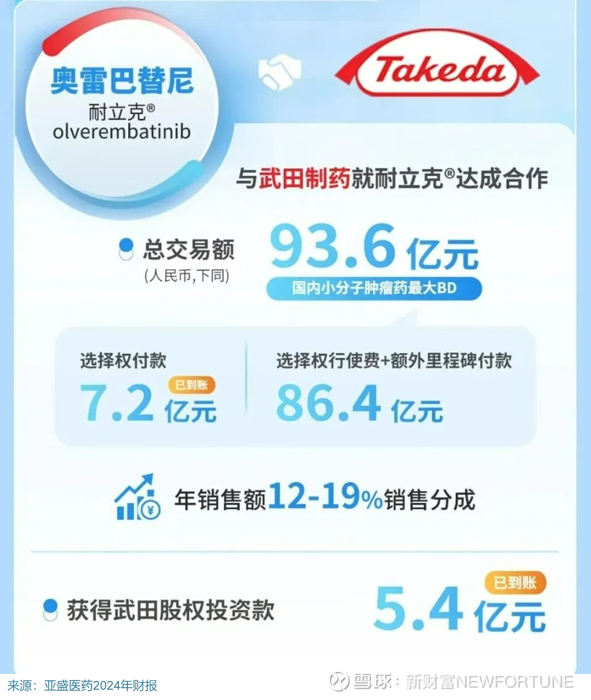 这笔交易的结构可谓层层嵌套、张力十足。首先,武田先付1亿美元选择权金,以此锁定耐立克除大中华区以外的全球独家商业化权益;如果未来产品在关键节点成功推进,亚盛还将获得最高12亿美元的里程碑付款,覆盖研发、注册和商业化多个阶段。除此之外,药物上市后,亚盛仍能从全球销售中获得12%–19%不等的分成。更重要的是,武田还以7500万美元、溢价25%认购亚盛7.73%的股份,直接成为公司第二大股东——这不仅是资金支持,更是属于“站队级别”的战略背书。