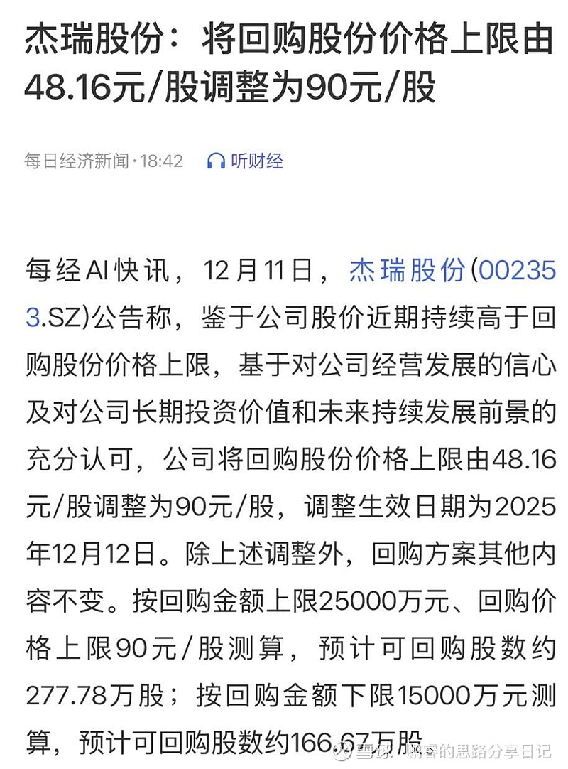 回购上限上调至90元!证明公司充分看好未来发展,上一次这么上调的还是三花智控,后续又来了一波主升!公司对未来发展的自信毋庸置疑也是来源于海外燃气轮机确定性的高需求,订单已经排到29年,今年已经接连落地2个大额订单,这次回购上调再次印证了燃气轮机的光明未来!一家做不过来,所以西门子又找上了三角防务一起做燃气轮机,无须多言,早信吃肉,晚信吃s$杰瑞股份(SZ002353)$ $三角防务(SZ300775)$ 之前早信的相同逻辑的博盈特焊吃撑了