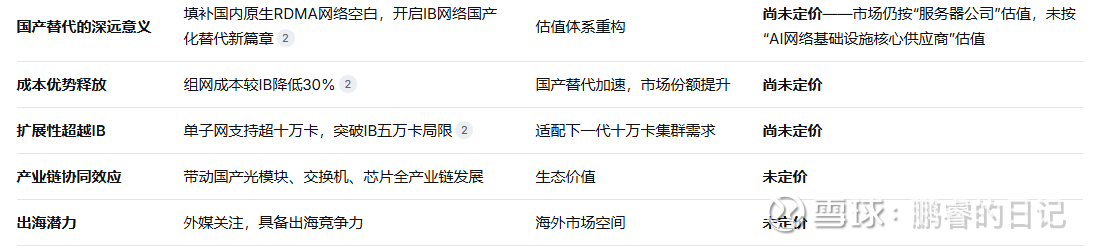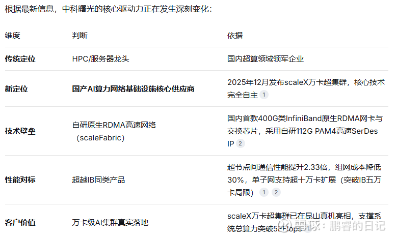 国产IB发布不仅填补了国内技术空白,更开启了IB网络国产化替代的新篇章。相比RoCE方案,曙光方案性能更优、成本更低、扩展性更强。它与润泽科技(AIDC)、中际旭创/长芯博创(光模块)形成完整的国产AI算力产业链协同