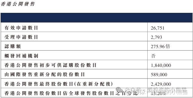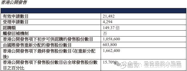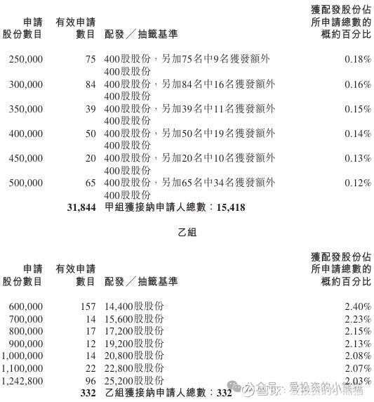 公开发售情况:21482人认购,这次公配149.37倍,由于超过100倍,回拨比率15.70%(按理说应该是50.00%),套路回拨了,国配有0.93倍,一手中签率10.00%,认购600手才必中1手,同时乙组163人申购,其中顶头槌申购35张,获配率1.36%-1.44%,