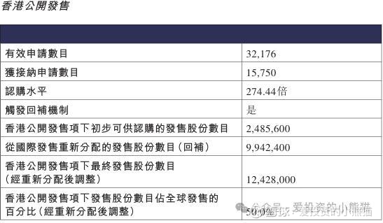 配售情况:32176人认购,这次公配274.44倍,十分火热,由于超过100倍,回拨比率50.00%,国配有2.49倍,一手中签率45.00%,认购250手才必中1手,同时乙组332人申购,其中顶头槌申购96张,获配率2.03%-2.40%。