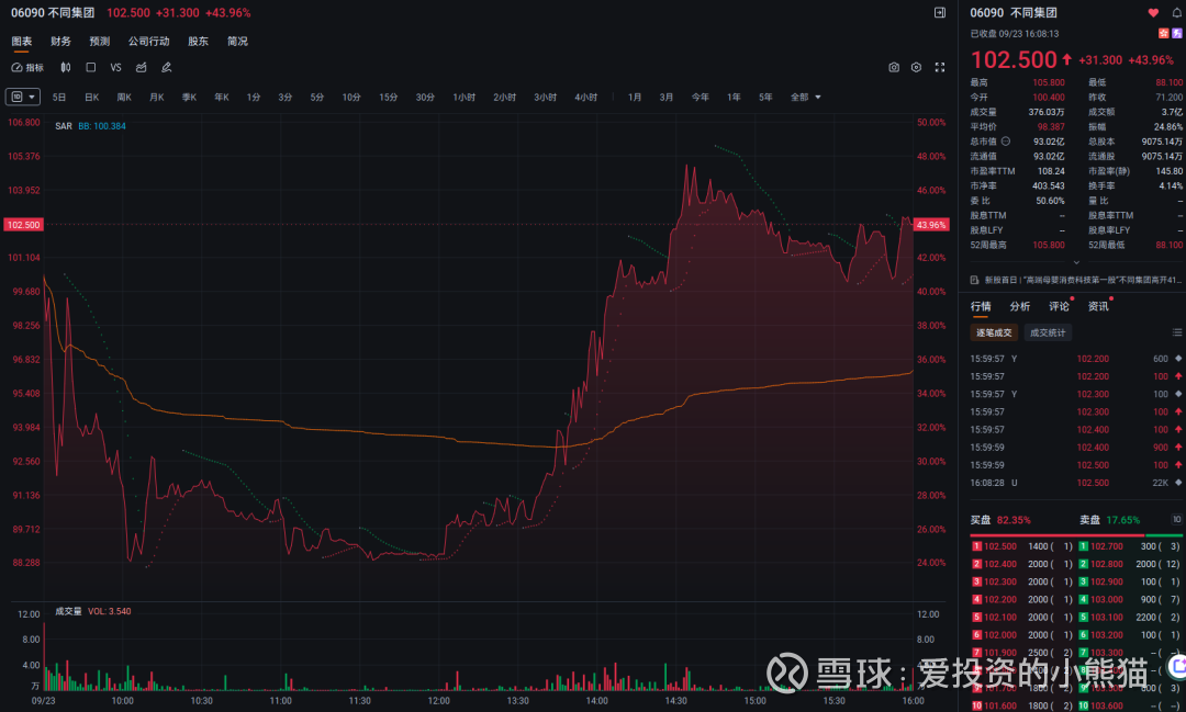 不同集团以每股71.2港元的上限定价发行,开盘价即跳涨至100.4港元,较发行价上涨41.01%,盘中最高涨幅超48%,触及105.80港元的高位。截至首日收盘,股价收于102.50港元,涨幅收窄至43.96%,总市值超过93亿港元。按每手100股计算,不计手续费,每手账面盈利达3130港元。不同集团(06090.HK) ,毫无悬念大涨,大家胃口越来越挑了,翻一倍涨幅都觉得涨少了,毕竟散户中签数量少。