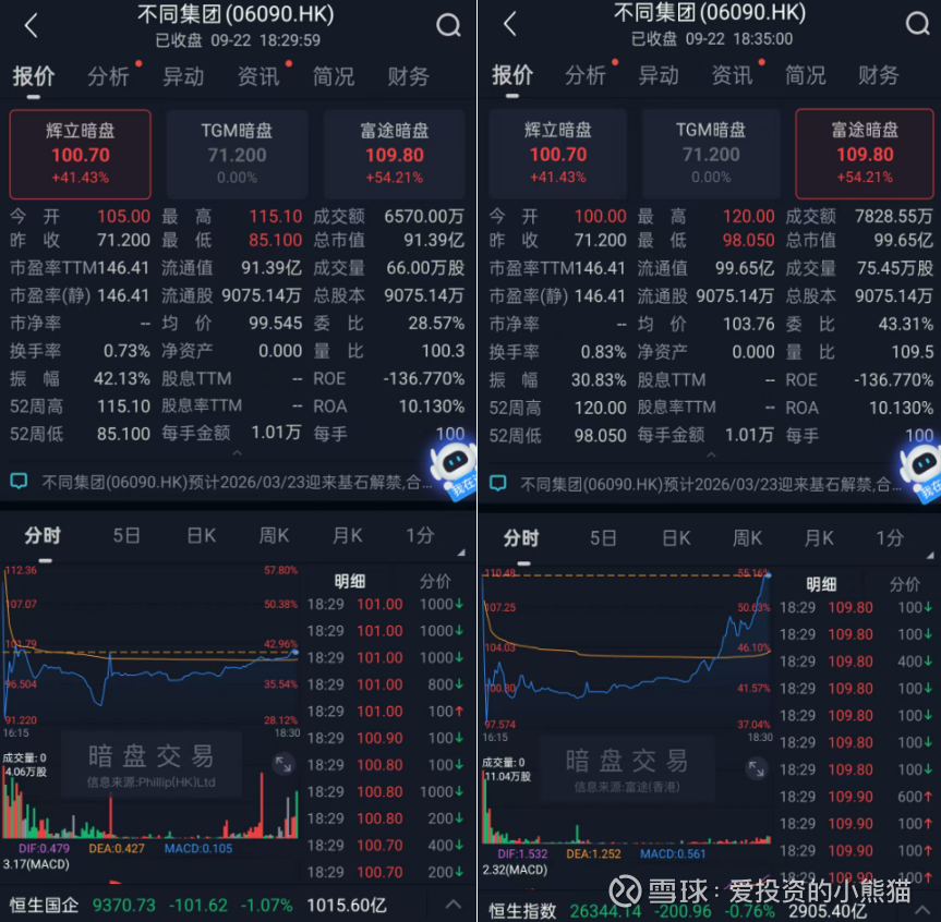 不同集团(06090.HK) 辉立暗盘以105.00港元高开,秒冲到最高点115.10港元后,回落到最低点85.10港元,再震荡整理,尾盘稍有拉升,以100.70港元报收,涨幅为41.43%,振幅42.13%,成交6570万港元。
