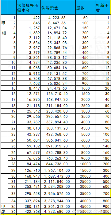 甲组的各档融资所需要的本金还有融资金额对应如下表: