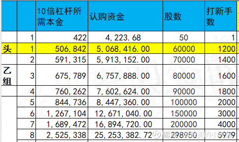 乙头需要认购资金507万,乙组的各档融资所需要的本金还有融资金额对应如下表: