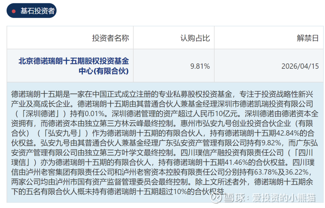 这里拆分一下这个基石:深圳德诺管理的资产设立的一个基金,德诺瑞朗十五期是产品,