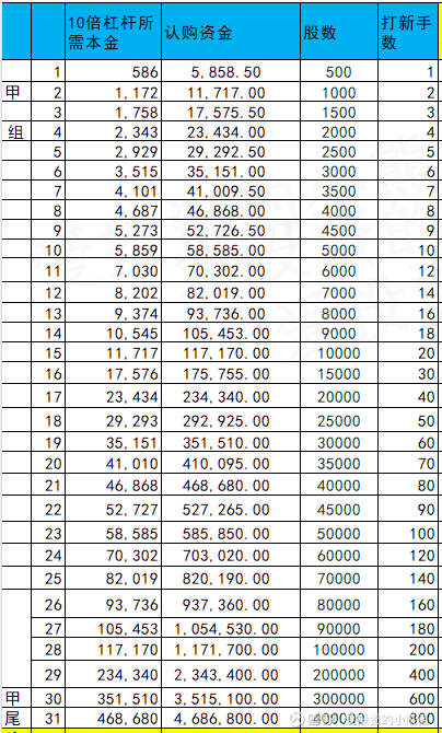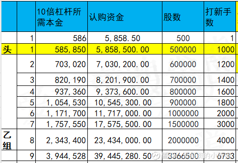 甲尾47万本金,乙头需要认购资金586万,乙组的各档融资所需要的本金还有融资金额对应如下表: