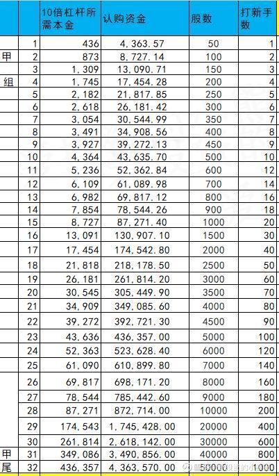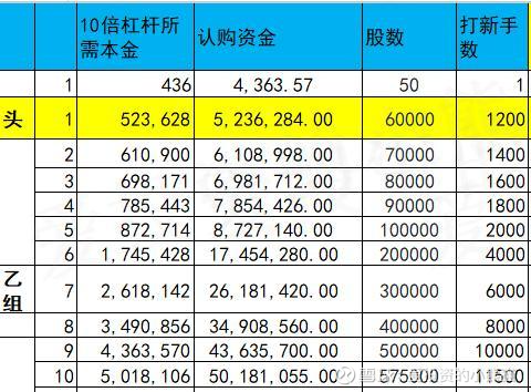 甲尾融资本金只要44万,乙头需要认购资金524万,乙组的各档融资所需要的本金还有融资金额对应如下表: