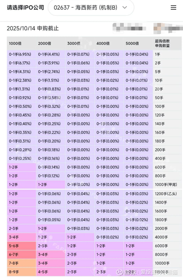 海西制药这个票集资额:8.04亿港元-9.94亿港元,募资金额挺大了,这个其实是好事情,至少中签率相对高一些这个募资规模之下,顶头槌不至于去抽签,佳鑫国际募资11亿很大,虽然是b10,但是中签率乙头都有万5了,比起很多新股万1万2的中签率要强很多了。