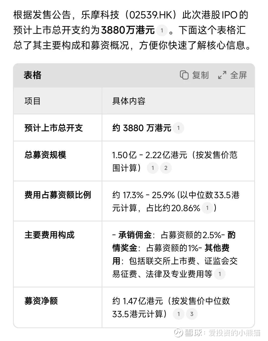 根据发售公告,乐摩科技(02539.HK)此次港股IPO的预计上市总开支约为3880万港元。下面这个表格汇总了其主要构成和募资概况。