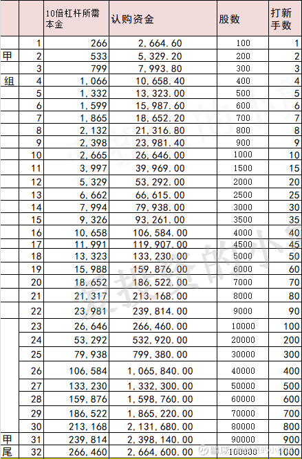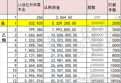 这个甲尾认购资金只有270万,乙头需要认购资金533万,乙组的各档融资所需要的本金还有融资金额对应如下表: