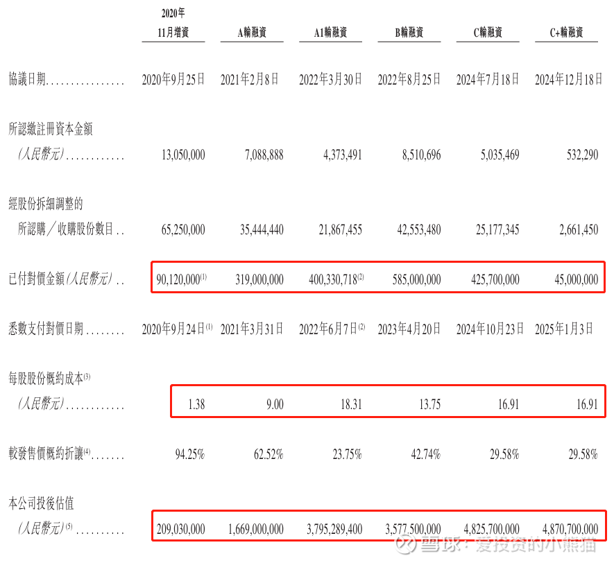 投后估值从2020年首次融资的2.09亿元人民币稳步攀升,2022年A1轮达37.95亿元;B轮估值小幅回调至35.78亿元,后续C轮及C+轮持续回升,最终C+轮投后估值定格为48.7亿元,C轮与C+轮每股认购成本均为16.91元。