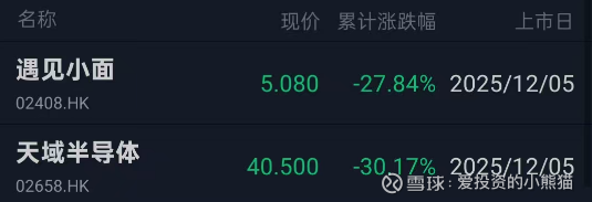12月5日,港股市场两只新股遇见小面(02408.HK)与天域半导体(02658.HK)同步挂牌,却双双遭遇开盘即破发的窘境,午间收盘时跌幅均超24%,与招股阶段的热度形成鲜明反差。