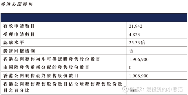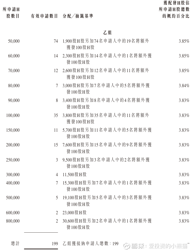 配售情况:21942人认购,这次公配25.33倍,由于执行分配机制B, 回拨比率无,国配有2.65倍,一手中签率4.32%,认购25手稳中1手,同时乙组199人申购,其中顶头槌申购0张,获配率3.83%-3.85%。