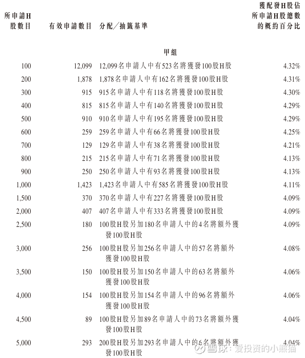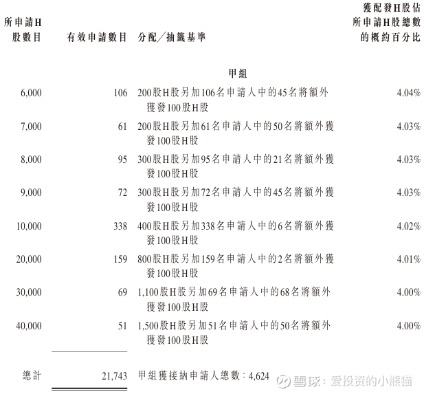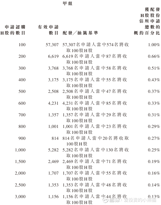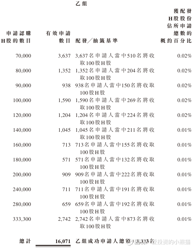 配售情况:135193人认购,这次公配4813.40倍,由于执行分配机制B, 回拨比率无,国配有2.33倍,一手中签率1.00%,公开认购不能稳中1手,同时乙组16071人申购,其中顶头槌申购2742张,获配率0.01%-0.02%。