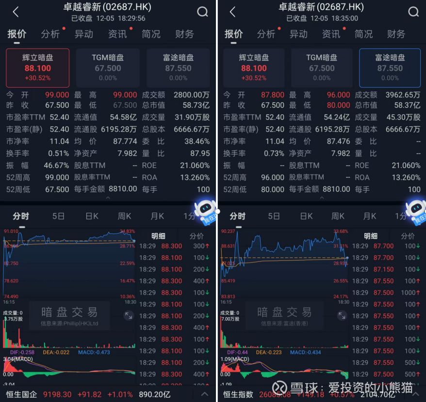 卓越睿新(02687.HK)辉立暗盘以最高价99.00港元高开,瞬间回落到最低点67.50港元,之后企稳反弹,尾盘以88.10港元报收,涨幅为30.52%,振幅46.67%,成交2800万港元。