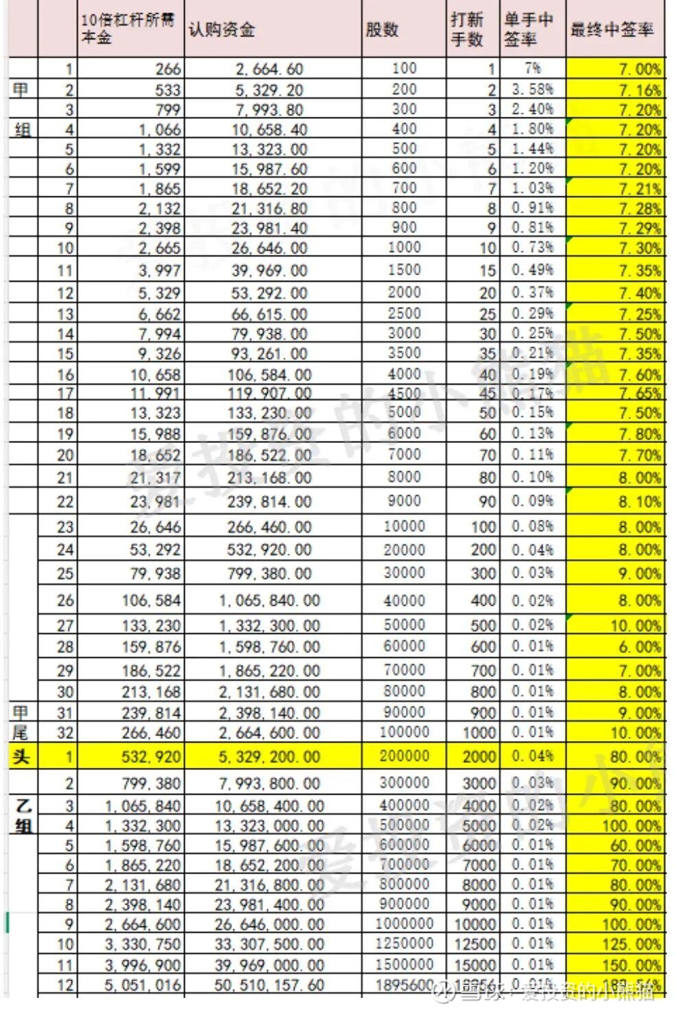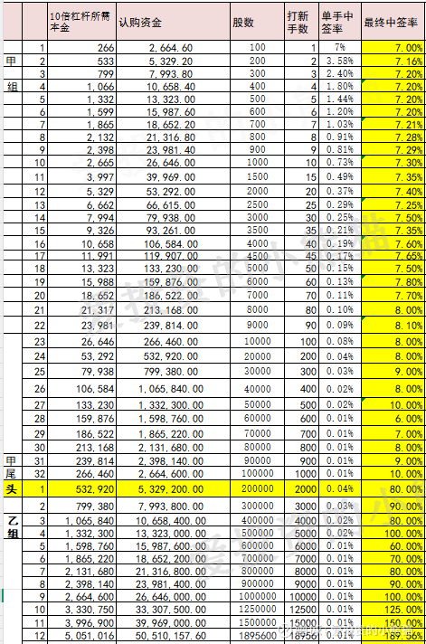 这次公配给货中签率尤其偏向于散户,一手中签率7%,甲尾中签率才10%, 乙组中签率很多档位几乎都在80%左右,也是偏向于小单玩众生平等的分配策略。当然好处就在于很多人都中签了,这个票的打新中签就变得极其容易。