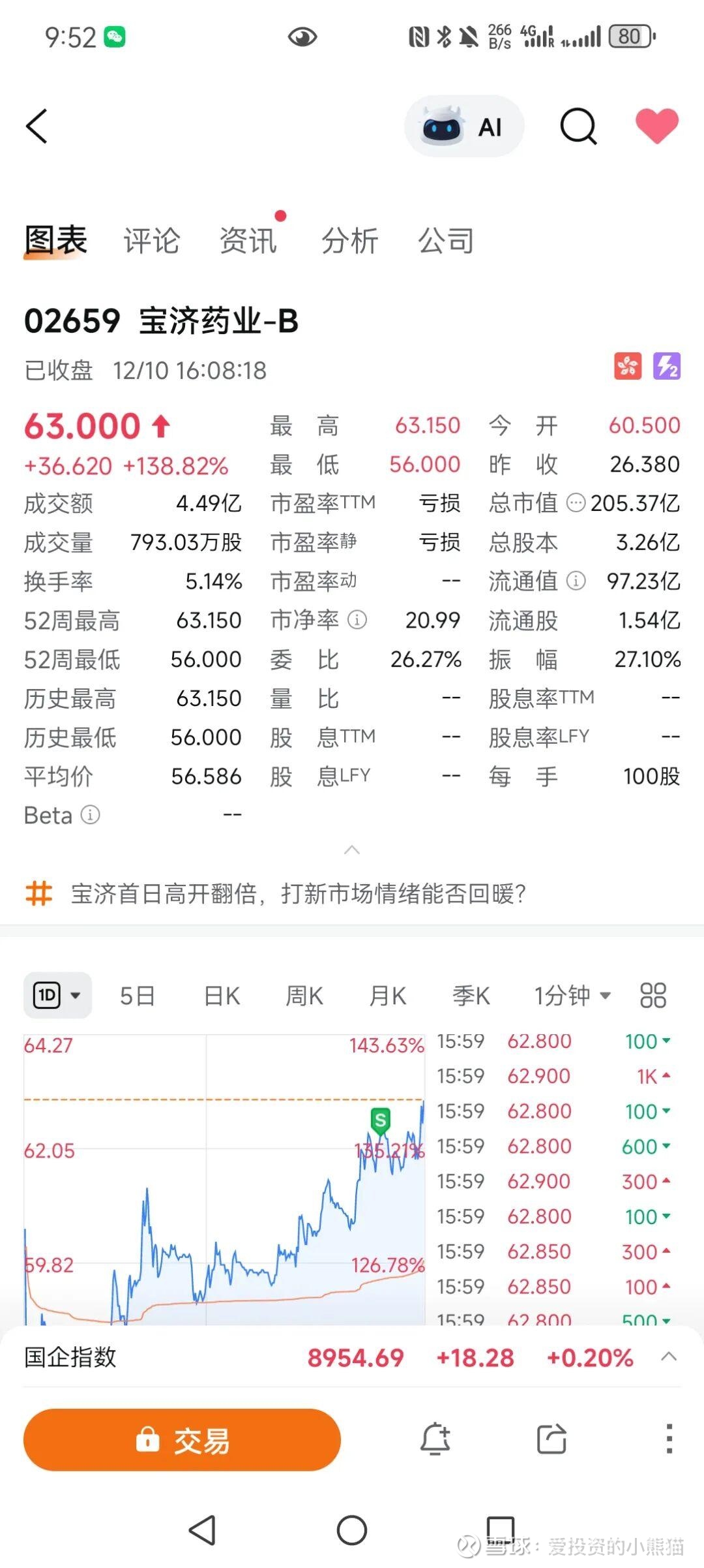 盘中震荡于56-63.15港元区间,最终收报63港元,较发行价大涨138.8%,全天成交4.49亿港元。募资总共十个亿,成交4.5亿快50%换手率了。