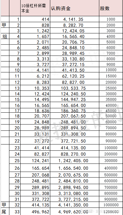 甲组的各档融资所需要的本金还有融资金额对应如下表: