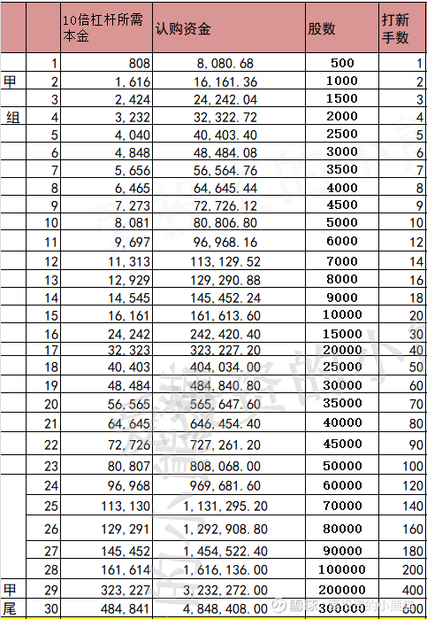 甲组的各档融资所需要的本金还有融资金额对应如下表: