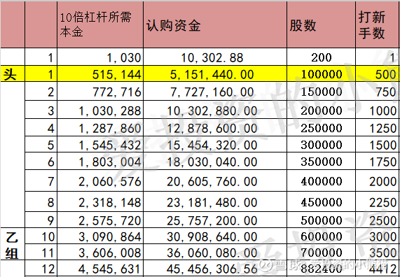 乙头需要认购资金516万,乙组的各档融资所需要的本金还有融资金额对应如下表: